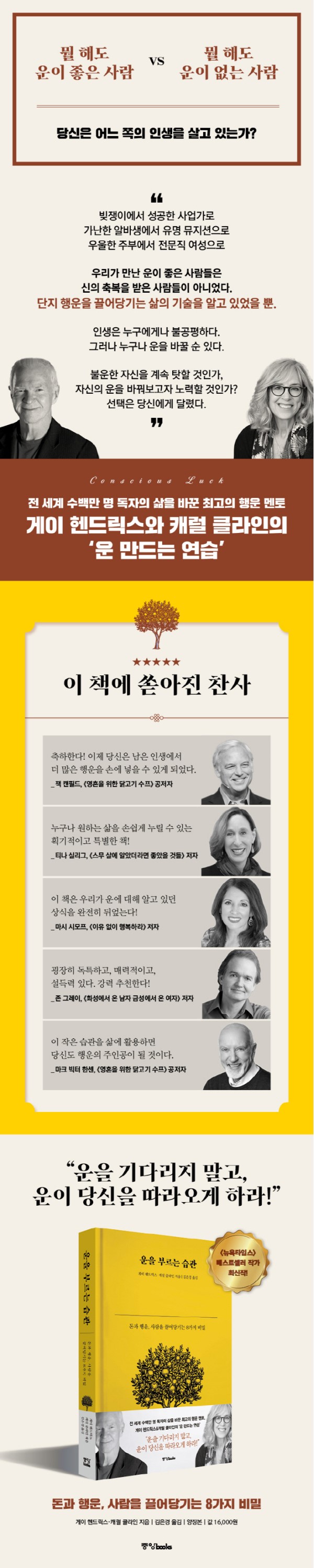 전 세계 17개국에 번역 출간되며 수백만 명 독자의 삶을 바꾼 책 《내 인생을 바꾼 단 한 권의 책》 저자이자 〈뉴욕타임스〉 선정 베스트셀러 작가 게이 헨드릭스와 아마존 출간 즉시 1위, 전 세계 5억 독자가 읽은 초대형 베스트셀러 《영혼을 위한 닭고기 수프》 시리즈 공저자인 캐럴 클라인. 두 특급 저자의 콜라보 소식만으로 아마존 기대작으로 떠올랐던 책《운을 부르는 습관》이 한국 독자들을 찾아왔다. 게이 헨드릭스는 스탠포드 대학교 출신의 세계적인 심리학 권위자로, 헨드릭스 재단 설립 후 약 8백여 명이 넘는 일류 기업 임원들 포함 수많은 사람들을 코칭해온 ‘행운 멘토’로도 유명하다. 이 많은 사람들이 큰돈까지 지불해가며 배우는 ‘운의 핵심과 비결’을 자기계발 전문 작가인 캐럴 클라인이 함께 정리했다.