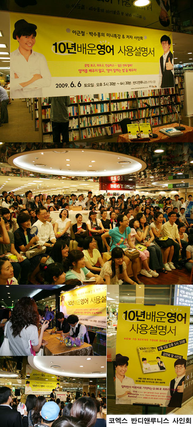 6월6일 토요일 오후 5시 30분 COEX 반디앤루니스에서 방송인 박수홍과 KBS 굿모닝팝스 진행자 이근철의 '미니특강 및 사인회'가 있었습니다. 반디앤루니스 내의 '북카페'에서 미니특강을 진행한 후 별도로 설치된 서점 바깥의 부스에서 사인회를 진행했습니다. 미니특강은 다소 한정된 공간에서 진행되어 맨 앞자리는 바닥에 앉아서 맨 뒷자리는 서서 강연을 들어야 했지만 끝까지 자리를 뜨지 않고 경청해 주신 많은 분들께 감사를 드립니다. 사인회에서 촬영한 사진은 중앙북스 네이버 공식 카페 <◀ 클릭>에 있습니다.      edited by Han / Photo by Ahn   |