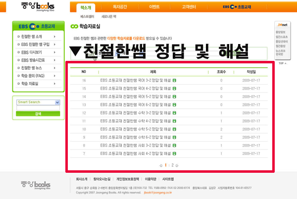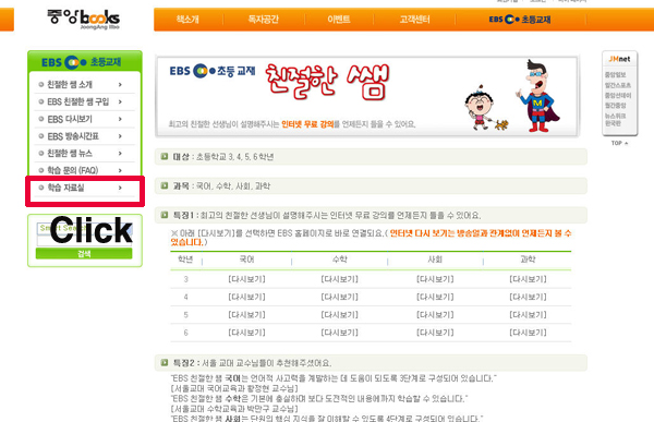 <친절한쌤> 교재에 실린 '정답 및 풀이 다운로드' 경로가 바뀌어 공지 안내합니다.   기존 보다 더 편리한 방법으로 다운로드할 수 있도록   자료실 게시판을 개설하였습니다.     다운로드 방법은 아래 내용을 따라해 주세요     STEP 1. 메인 페이지 상단의 'EBS 초등교재' 항목을 클릭해 주세요.       STEP 2. 왼쪽 게시판 목록 제일 아래에 있는 [학습 자료실]을 클릭해 주세요.       STEP 3. 친절한쌤 정답 및 풀이 PDF 파일을 다운로드 합니다.     <친절한쌤 정답 및 풀이 등록된 순서> 국어 3-2 국어 4-2 국어 5-2 국어 6-2 수학 3-2 수학 4-2 수학 5-2 수학 6-2 사회 3-2 사회 4-2 사회 5-2 사회 6-2 과학 3-2 과학 4-2 과학 5-2 과학 6-2   앞으로도 더 편리한 서비스를 위해 노력하는 중앙북스가 되겠습니다.   |
