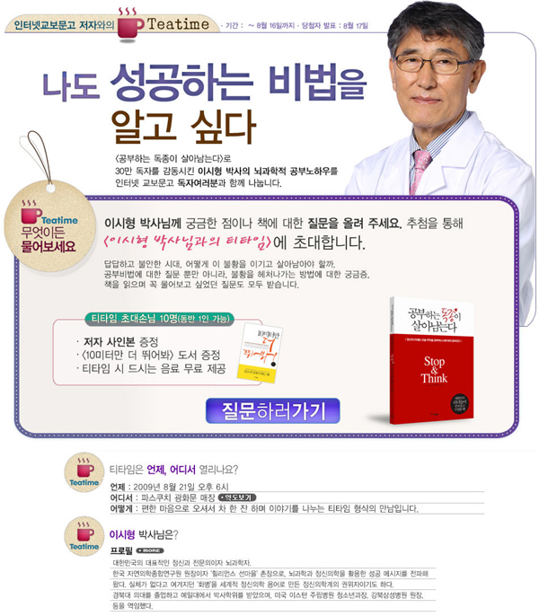 <공부하는 독종이 살아남는다>로 30만 독자를 감동시킨 이시형 박사님과의 Teatime에 여러분을 초대합니다.   응모 기간 : 8월 16일 당첨 발표 : 8월 17일   초대 손님 : 10명 / 동반 1인 가능       인터넷교보문고 바로가기 ▶ http://www.kyobobook.co.kr/prom/2009/pube/07/090720_teatime.jsp   |