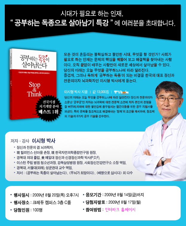 인터파크에서 응모해 주세요         Keep in Mind   01 한치 앞도 알 수 없는 현대 사회 살아남으려면 공부가 필수 기업이 원하는 인재는 점수 높은 사람이 아니라 창조적인 사람 사회는 빠르게 변한다 끊임없이 당신을 업그레이드하라.   02 '진짜 공부'는 문제의 창조적 해결법을 배우는 일 문제 해결의 3단계 : 주인 되기 → 문제 발견 → 문제 해결 공부를 해야 구체적 해결 방법을 안다. 얄팍한 이력서나 채우는 공부는 그만 공부는 진짜 써먹을 수 있어야 한다.   03 공부는 '저위험 고수익'의 확실한 투자처이자 젊음의 명약 저위험 : 종잣돈 No 부작용 No 필요한 것은 시간과 노력뿐 고수익 : 실력 향상 성취감 행복감 두뇌 활성화 → 해마 신경 세포 증식 → 노화 예방   04 나이 든 후에는 오히려 공부가 잘된다 이미 자기 진단이 되어 있고 과거의 공부 경험이 요령을 찾아 준다. 절실한 만큼 몰입이 쉽고 충분한 투자의 여유가 있다. 공부 내용을 응용할 기회가 많고 성취감이 크다.   05 공부의 유일한 걸림돌은 자기 한계 설정뿐 머리는 나이와 상관없이 쓸수록 좋아진다. 공부를 하면 할수록 해마 신경 세포가 늘어나 기억력이 좋아진다. 정보를 통괄하는 통괄성 지능은 나이가 아니라 노력에 따라 달라진다. |